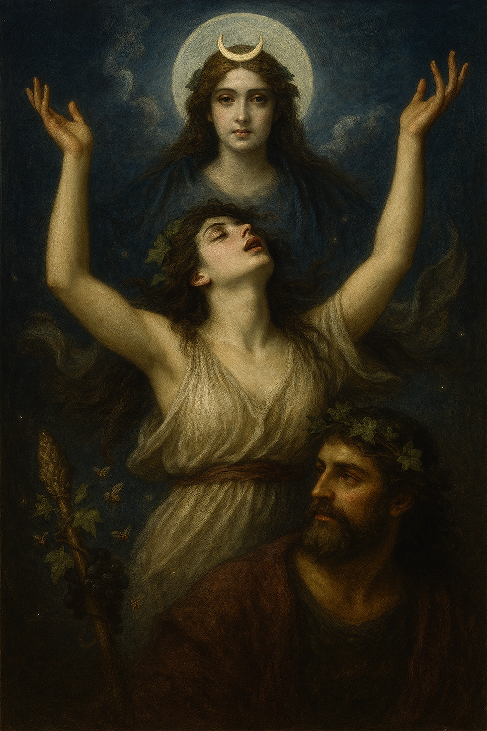 The ancients believed that madness was not merely an affliction but a visitation — a moment when the boundary between mortal and divine thinned. Two powers were most often invoked in this threshold state: Luna, whose shifting light stirred the tides of the mind, and Dionysus, whose presence dissolved the self in ecstasy.